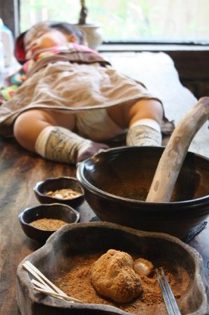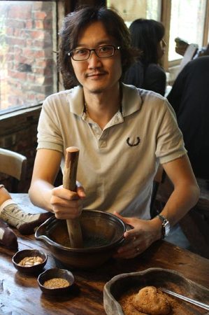 然後加上擂茶粉(綠綠像抹茶粉的東西) 再擂個五分鐘 整個變成油膏狀 才可以沖熱水喝