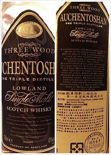 歐肯特軒AHCHENTOSHAN Three Wood,過American Bourbon/Spanish Oloroso Sherry/Pedro Ximenez casks三桶的黑色標籤限量版(是已經不再生產的珍貴版本,現在很難找到啦!)