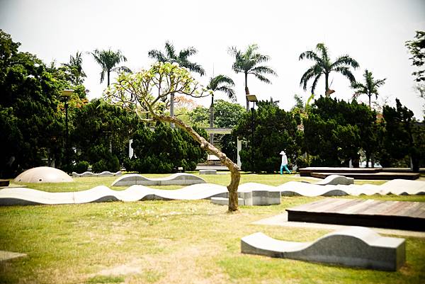 地景平台是台南公園有名的噴水池原址,在一百年前,日本人設計的噴水池可以噴出三層樓高的水柱,是遊人爭相拍照的景點,但日本戰敗後,噴水池荒廢,由國民政府重新改造、增建蔣公雕像,可惜噴水池維護不易、池水汙濁易孳生蟲害,現在皆已移除,改以「城牆意象」的波浪形造景、木棧平台取代,平滑的波浪石墩可以讓孩子攀爬玩耍、大人休憩閒聊,成為假日民眾野餐的好地方。坐在起伏的石墩中,遙想台南城池的古今變化,頗耐人尋味。