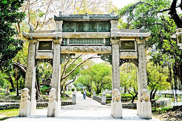 建於清嘉慶二十年(1815)的「重道崇文坊」,是公園目前年代最久遠的完整古蹟,清廷為表揚台灣藝術家林朝英捐助萬兩修建縣學(孔廟),特頒重道崇文匾額,並准建坊,才誕生這座雕工精細的石坊。目前全台僅存四座清代石坊,其珍貴程度不言可喻。重道崇文坊原址位於龍王廟街(今南門路一帶),後遷移至台南公園,與燕潭相互輝映,現在已是外地遊客拍照的熱門景點,除了跟石坊合影,也不忘和柱旁的可愛石獅雕像合照自拍,百年古蹟卻仍平易近人,充滿童趣!