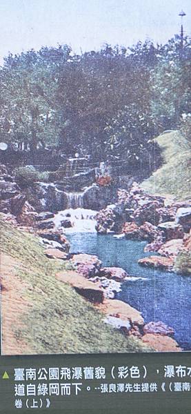 1917年台南公園落成時,耗費眾多人力物力修築而成的假山飛瀑是最受矚目的焦點,到飛瀑前與淙淙流水拍張照片成為很多人心中的願望,戰後漸漸荒廢,台南市政府為了慶祝公園百歲生日,進行多項修復及美觀工程,其中最具意義的包括「重建日治時期瀑布景觀風貌」,讓年久失修的水道再度成為公園裡最美的景觀。炎炎夏日,在飛瀑旁享受水花濺起的清涼,彷彿可以看到當年穿著和服的少女、戴著畢業帽的學生在這裡留下的時代畫面。