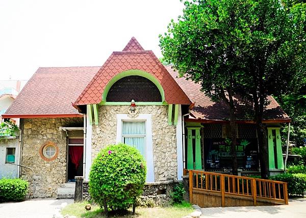 在假山飛瀑與兒童遊樂園旁,會看到一間可愛的警察局,有紅屋頂、黃石牆,造型典雅,像西洋童話故事裡的森林小屋,門口的設計卻又讓人想起日式鳥居。