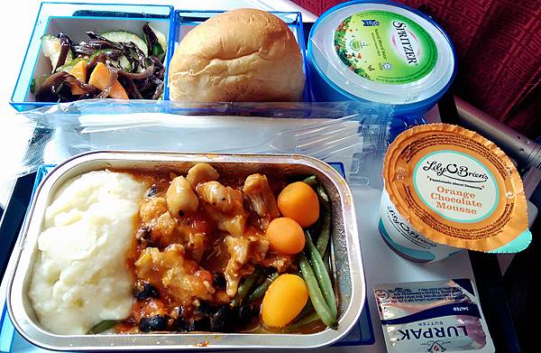 番茄汁清爽的酸佐上洋芋泥的綿密奶香,加上軟嫩的雞腿肉塊,大小通吃,女兒們毫不客氣把整盤掃光!調味恰到好處,有點難以相信是飛機餐的水準。