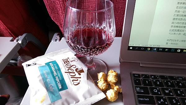 空姐第四度送上果汁飲料和爆米花(我跟老公當然又各自續了一杯酒),