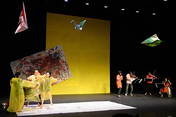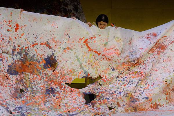 當演員把身體滾滿了油彩、畫布也染上繽紛的顏色後,團長宣布~~請孩子們開始拋擲手上的紙飛機!一時間,劇場的天空飛滿了紙飛機,大人的心好像也跟著孩子回到童年那純真的時空,真的是很迷人的一瞬間。