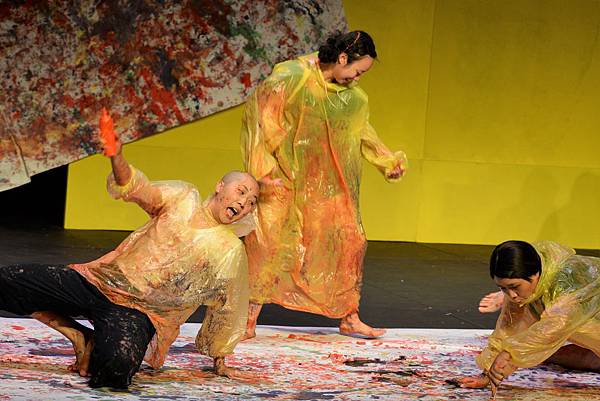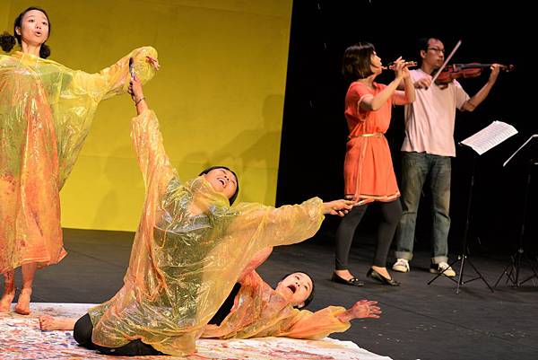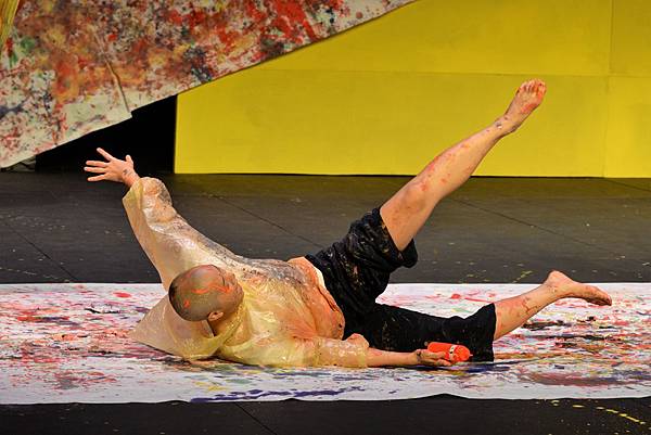 專心地完聆聽三首古典樂曲,其實……現場氣氛開始有些壓抑的蠢蠢欲動,年紀小一點的孩子似乎會坐不住了……果然~~驚喜出現啦!《野孩子》們再度上場,還帶著一堆顏料,用自己的身體,在劇場地板上的巨大白紙作畫~~