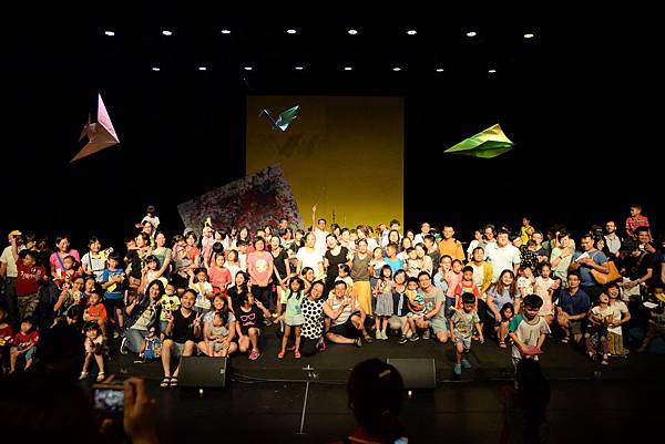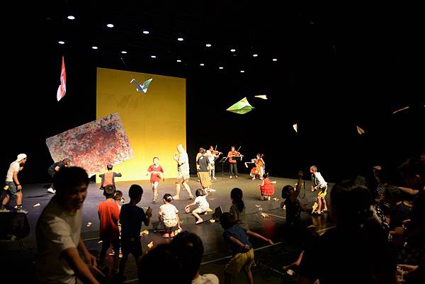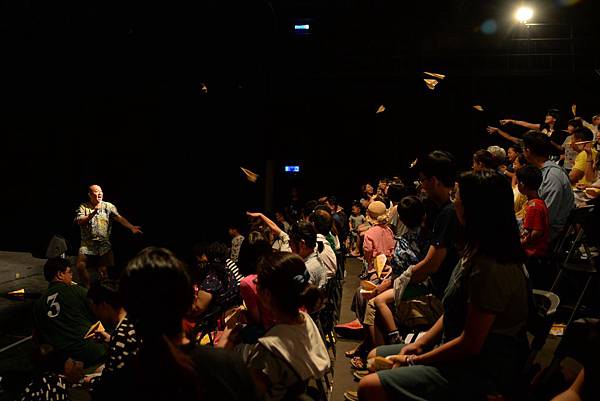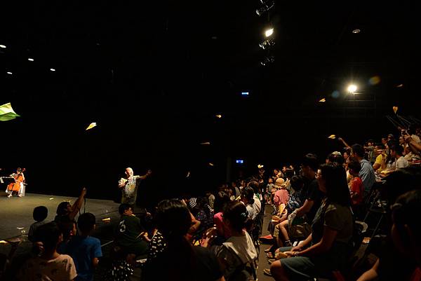 下半場一開始,工作人員就預告:「歡迎拍照,並且請準備好用節目單摺的紙飛機,準備與演員一起互動」,全場孩子陷入一種蠢蠢欲動的興奮期待。