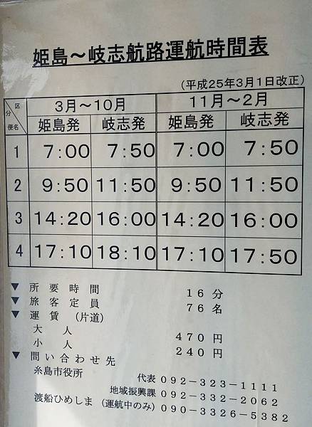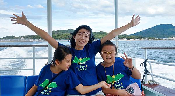 船艙內整潔、艙外也有一排座椅可以吹海風看風景,十分鐘航程就可以抵達姬島。來回票價大人八百多,小孩四百多,細節等之後有空再專文說囉!