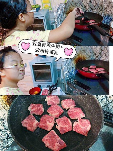 女兒很認真的做了牛奶馬鈴薯泥+煎牛肉