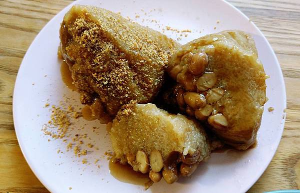菜粽相較之下好多了,很多熟透綿軟的花生,搭配Q軟的糯米與月桃葉淡淡的香氣,撒上花生粉跟醬油膏真是超好吃的!而且圓環頂的辣醬超讚!淺淺米黃色的醬汁卻有頗夠味的辣度,完全提升菜粽的風味層次!