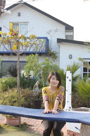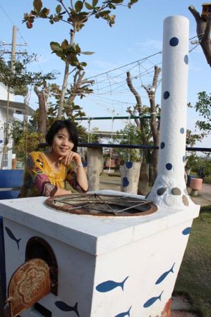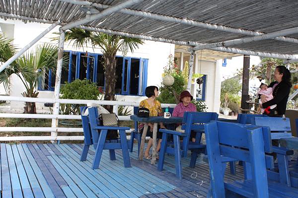 在魚塭中央的藍白色地中海風手造屋 頗有優閒的南國氣息呢