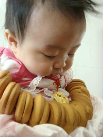 (三)將餅乾扳下來 在莉塔的小嘴邊回兩下 然後請長輩吃掉